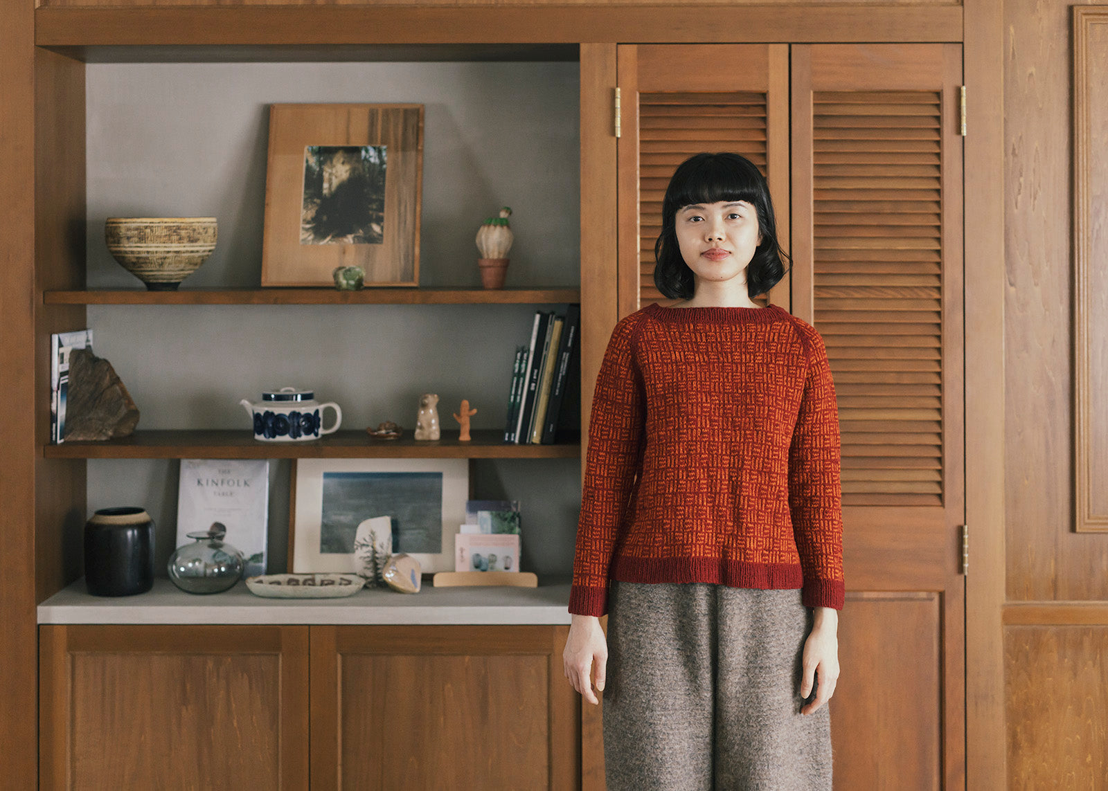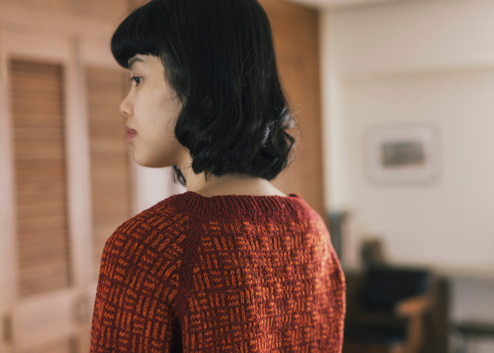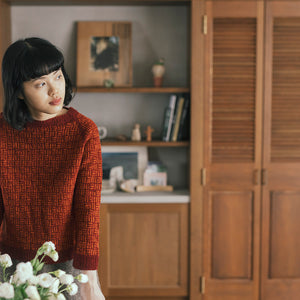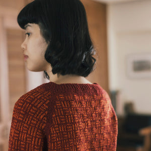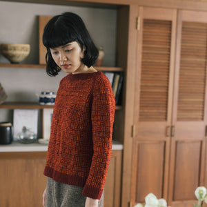 日本の伝統文様「三崩し」をヒントに考えられたラグランスリーブのプルオーバー。2色で編む模様の色の混じり合いや線の揺らぎがセーターに奥行きを与えています。浅いボートネックが軽やかな雰囲気を醸し出しているのもポイントの一つ。コントラストの強い2色やポップな色合いで編むのも楽しそう。
