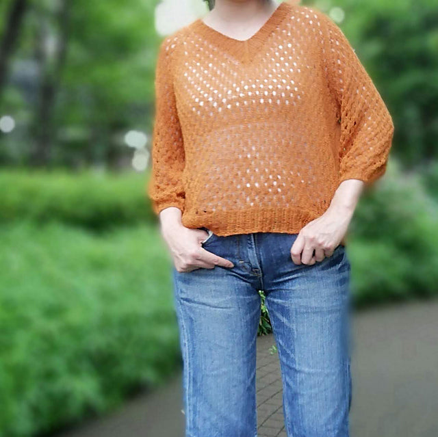 ウェア編みに最適なソフトなリネン糸だからこそ、肌に触れた時の心地よさが格別です。チェーン状の構造により、編み地は軽やかで通気性に優れ、夏の暑さの中でも快適に着用できます。