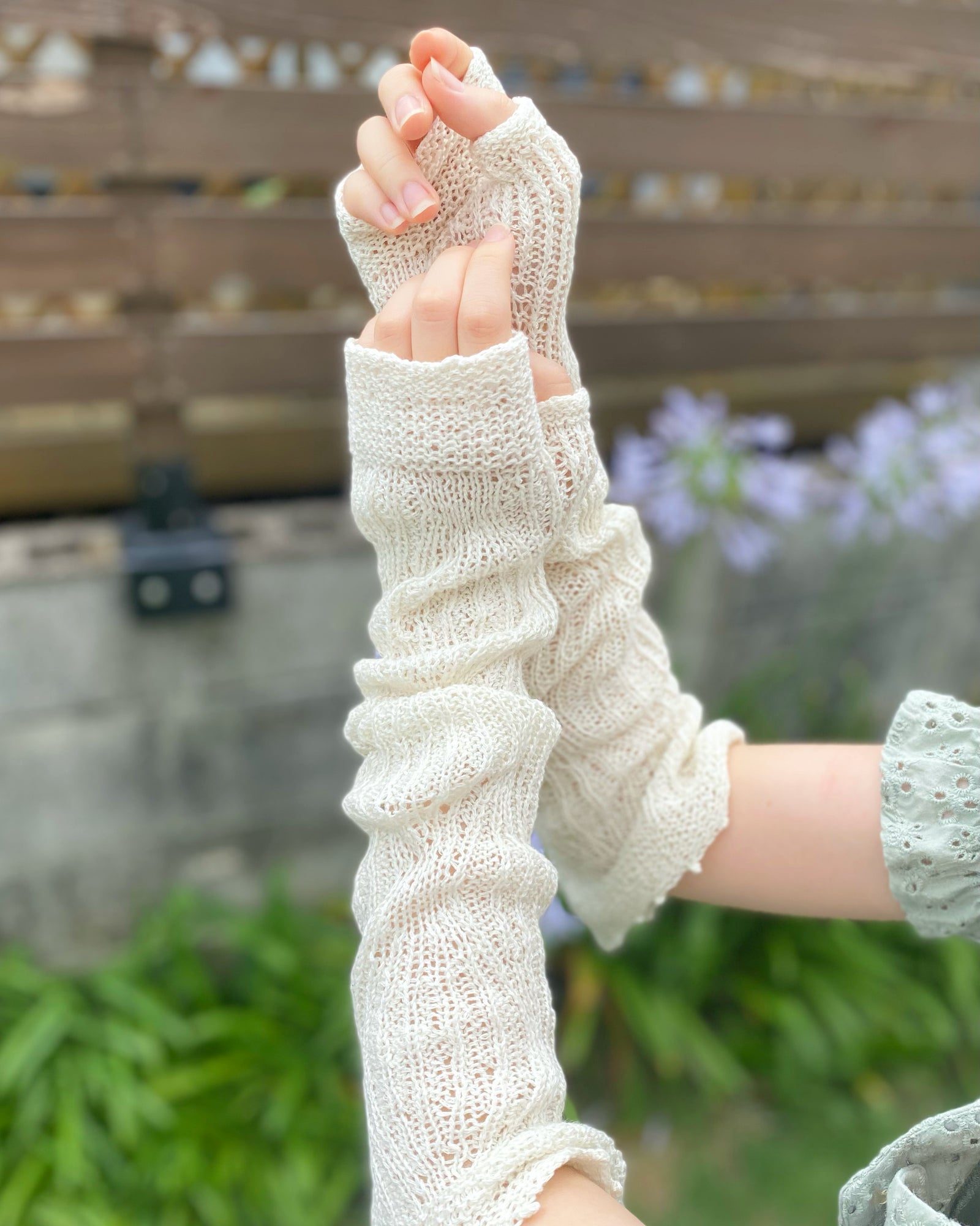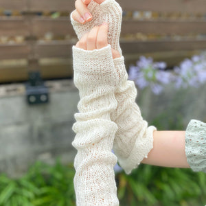 親指を入れて、手の甲まですっぽりカバーできるのが嬉しい。日除けだけなく、きつい冷房対策にもおすすめです。手首のあたりでクシュっとさせるとおしゃれ度UPです。