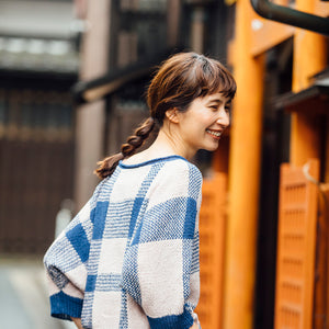 2色の糸で編みます。チェック柄の縦のラインはインターシャで糸を縦に渡しながら、横のラインは段ごとに色を変えながら編みます。チェック模様を活かして、形はシンプルでたっぷりとしたドルマンスリーブ。リネンの編み地が作るドレープが美しく、風が通るので爽やかに着られます。色と模様の配分にこだわり、どの方向から見ても美しいプルオーバーです。