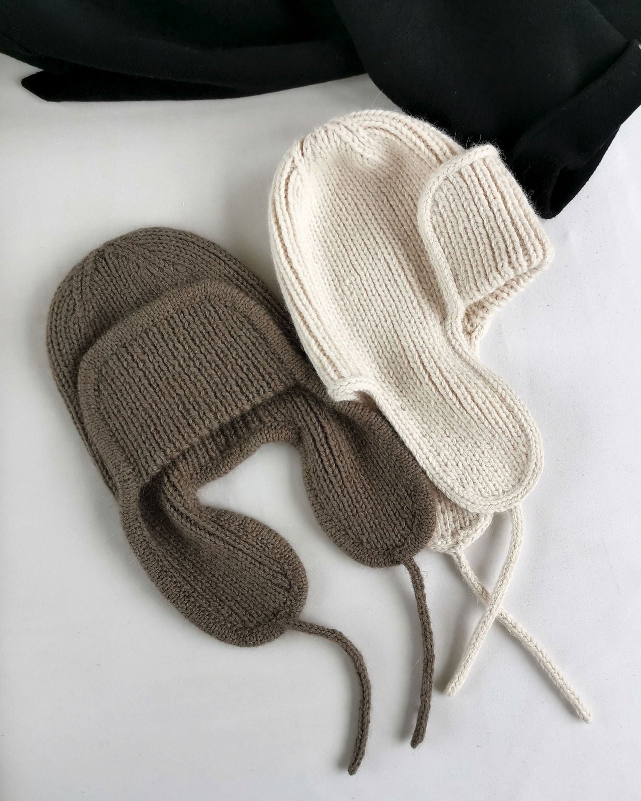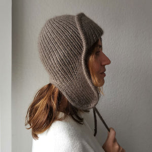 最初に耳あてとフロントパネルを別々に平に編み、つなげます。その後は輪にして、クラウン部分で減目します。最後にI-Codeまたはダブルのメリヤス編みで縁編みを仕上げます。両バージョンともにパターンに編み方を記載しています。