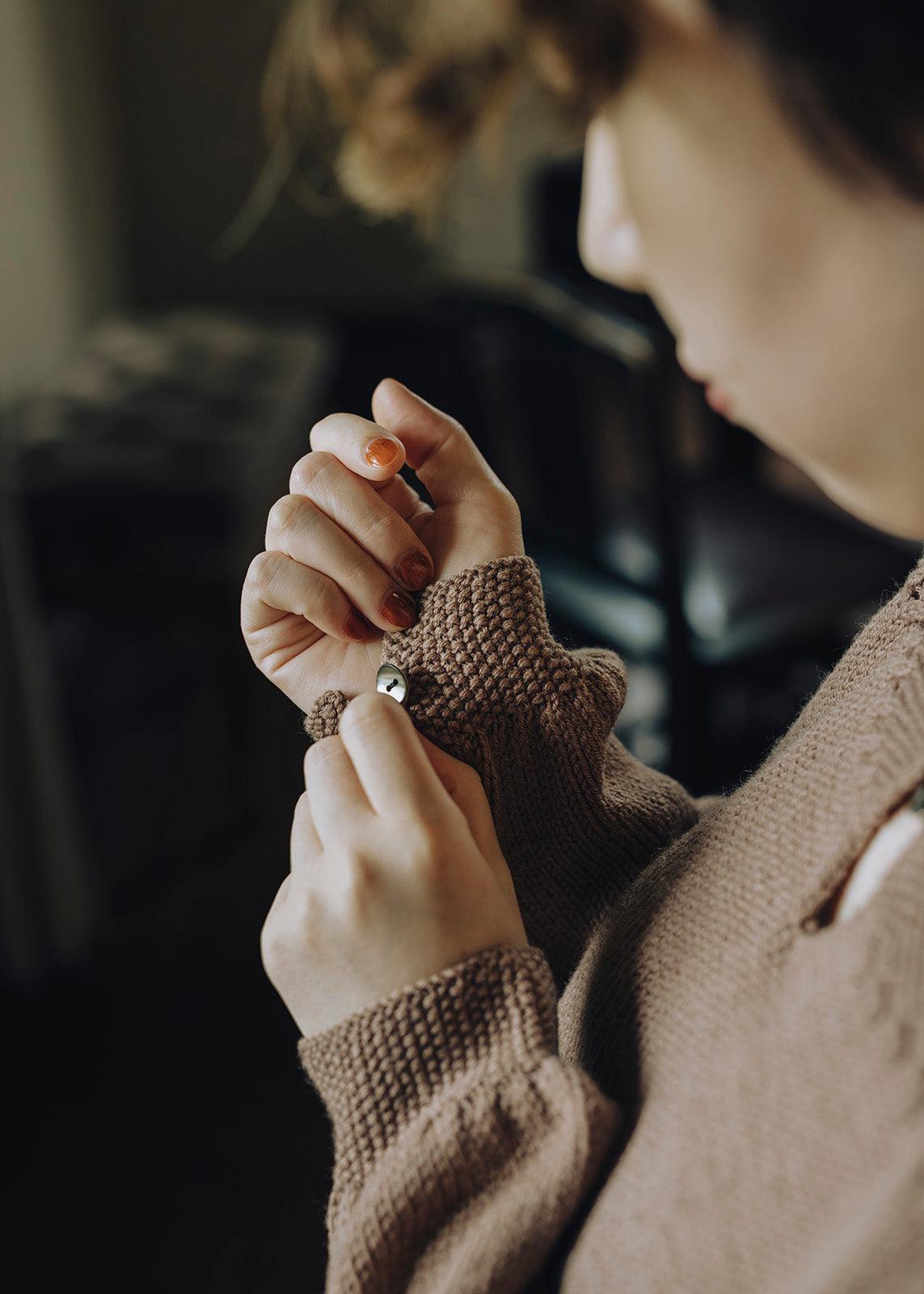 背中から編み始め、肩に向かって往復編みして、左右の肩を分けて前肩をそれぞれ編みます。前身頃中央に胸元のスリットを入れて左右の前身頃をつないだら脇下まで編み進め、後ろ身頃も脇下まで編み、前後身頃をつなげて裾まで輪で編みます。裾は引き返し編みで後ろ下がりのカーブを作ります。袖は袖ぐりから目を拾い、引き返し編みで袖山をつくり袖口に向かって輪で編み、袖口のスリットからカフは往復編みで編みます。最後に前身頃中央のスリット、両袖のカフにボタンとボタンループをつけて仕上げます。