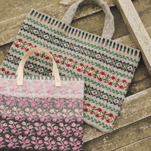かわいらしい木の実の模様のトートバッグ。普段使いにぴったりです。ウェアBressayと同じ模様なので、お揃いで持っても素敵。細やかな編み込み模様のおかげで丈夫な仕上がりです。持ち手は毛糸で編んでも革のものをつけても。