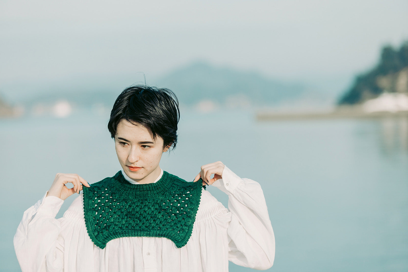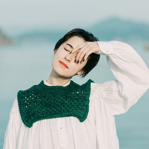 ぷっくりしたピスタチオステッチと脇のピコット編みが可愛い。適度な弾力とハリのあるSprintで編むので、編みやすく、模様がふっくらと仕上がります。小ぶりなので付け襟の感覚で着けられそう。肩を温めてくれて、長い季節使えます。