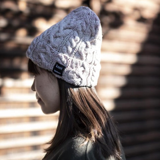 ブリムからモリモリのケーブル編み。折り返したブリムから本体にケーブル模様が繋がって見えるのがポイントです。ヨリのきいたHikeで編むので気持ちよく模様が出ます。サラッとした肌触りで、ウールのチクチクが苦手な方にもおすすめです。もっちりと弾力があるHikeで編むので、てっぺんがすくっと立って、頭の形をよく見せるとんがり帽子になりました。
